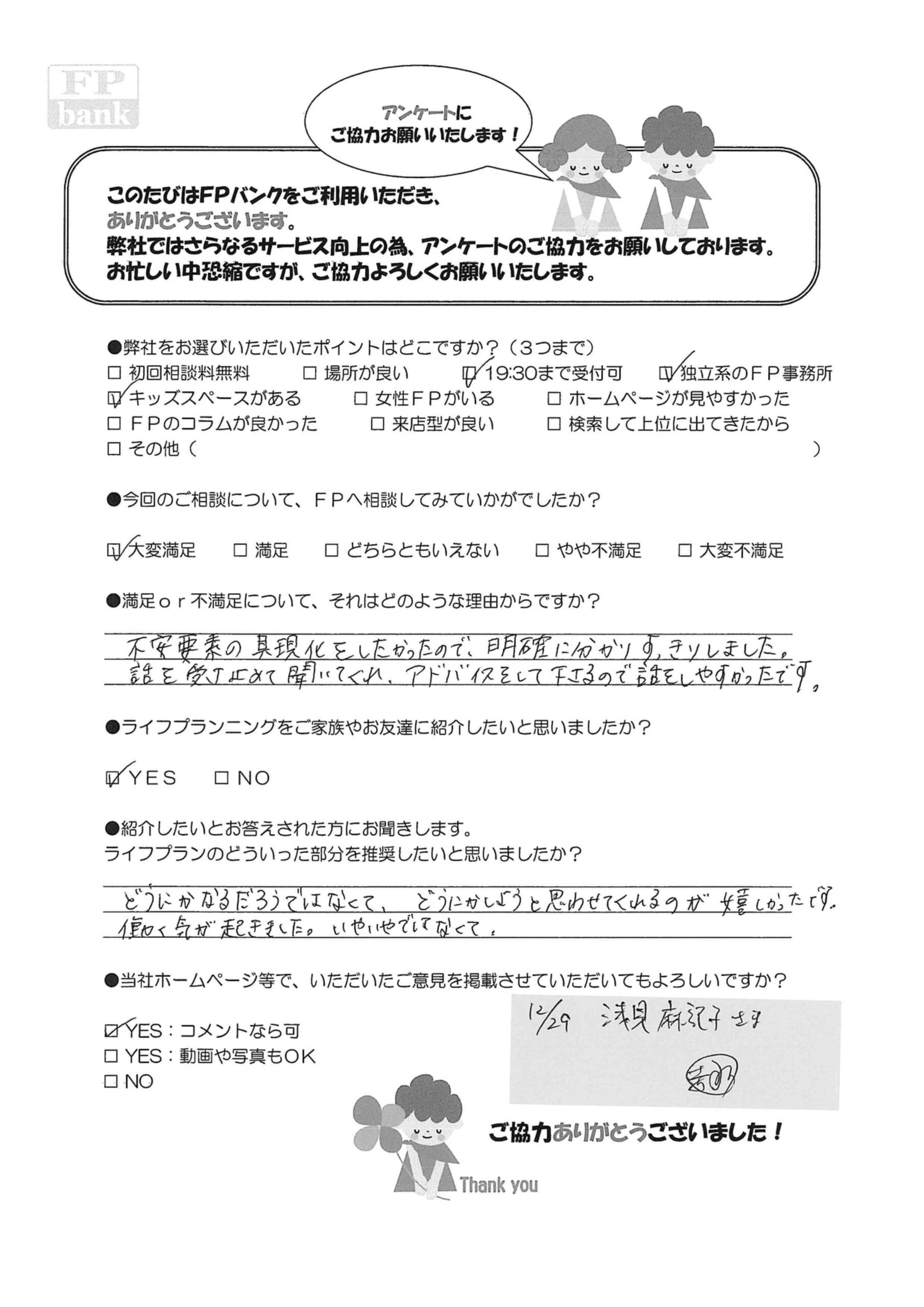 アンケート詳細 HOME > アンケート > どうにかしようと思わせてくれるのが嬉しかった。 ■当社を選んだ理由 19:30まで受付可・独立系のFP事務所・キッズスペースがある ■ご紹介の理由 どうにかなるだろうではなくて、どうにかしようと思わせてくれるのが嬉しかったです。 働く気が起きました。いやいやではなくて。 ■満足度 大変満足 ■ご意見・ご感想 不安要素の具現化をしたかったので、明確に分かりすっきりしました。話を受け止めて聞いてくれ 、アドバイスをしてくださるので話をしやすかったです。 Write執筆アンケート 拡大して見る +