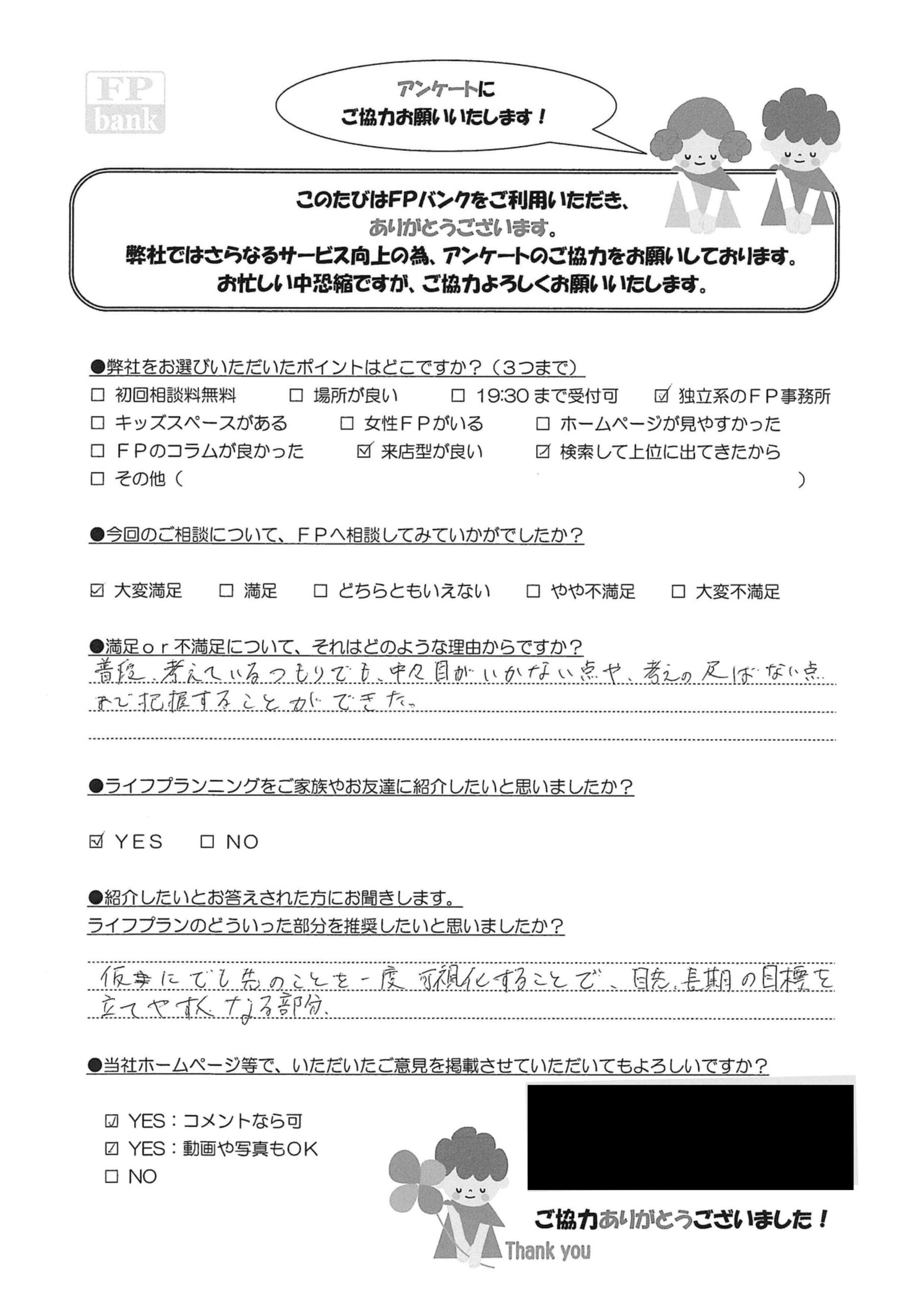 アンケート詳細 HOME > アンケート > 考えの及ばない点まで把握することができた。 ■当社を選んだ理由 独立系のFP事務所・来店型が良い・検索して上位に出てきたから ■ご紹介の理由 仮にでも先のことを一度可視化することで、目先、長期の目標を立てやすくなる部分。 ■満足度 大変満足 ■ご意見・ご感想 普段考えているつもりでも、なかなか目がいかない点や、考えの及ばない点まで把握することができた。 Write執筆アンケート 拡大して見る +